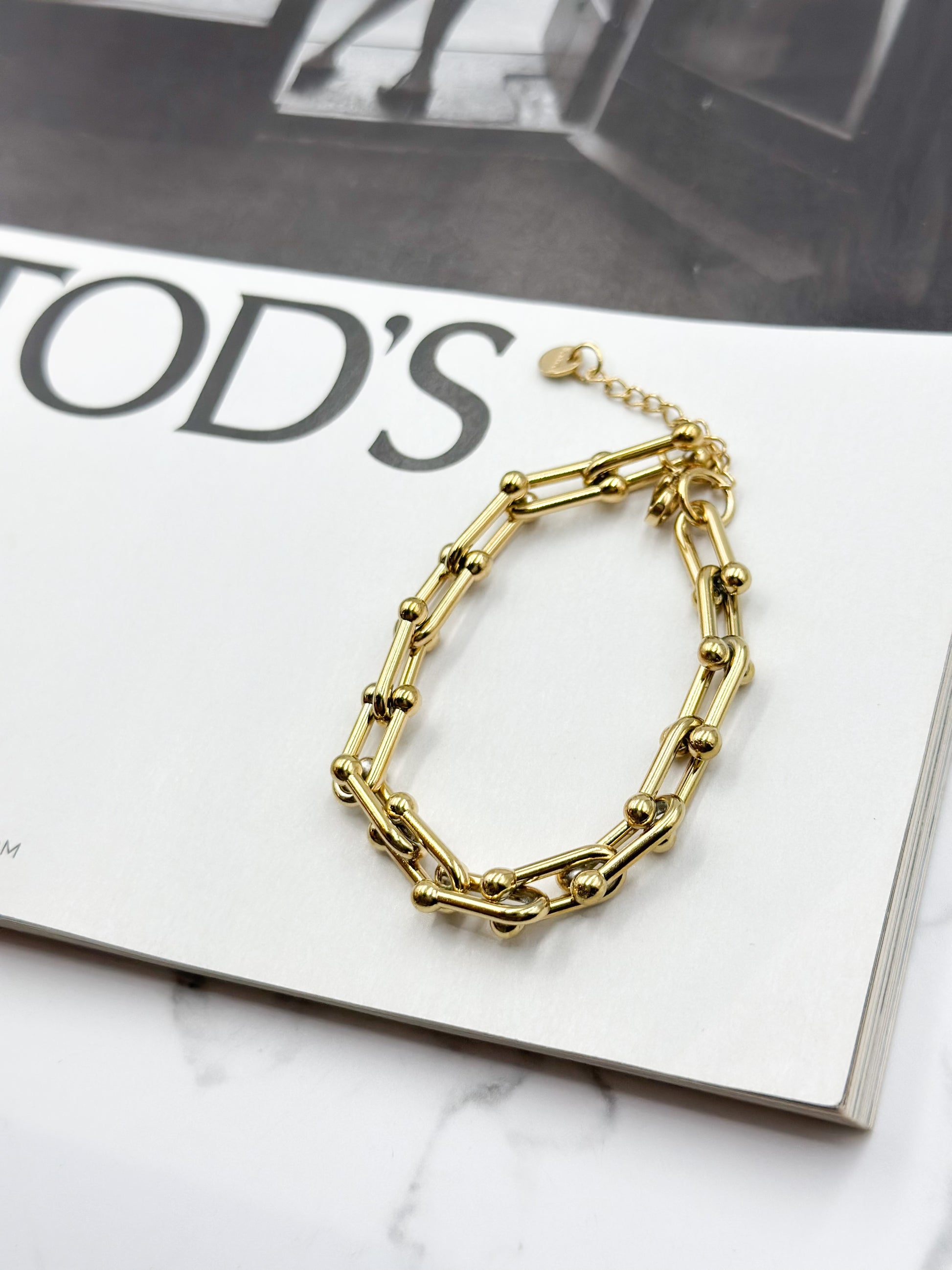 Κατασκευασμένο από ανοξείδωτο ατσάλι με χρυσή επιμετάλλωση, διαθέτει ιδιαίτερη αλυσίδα με κυλινδρικούς κρίκους και σφαιρικές λεπτομέρειες που προσδίδουν μοντέρνο χαρακτήρα.