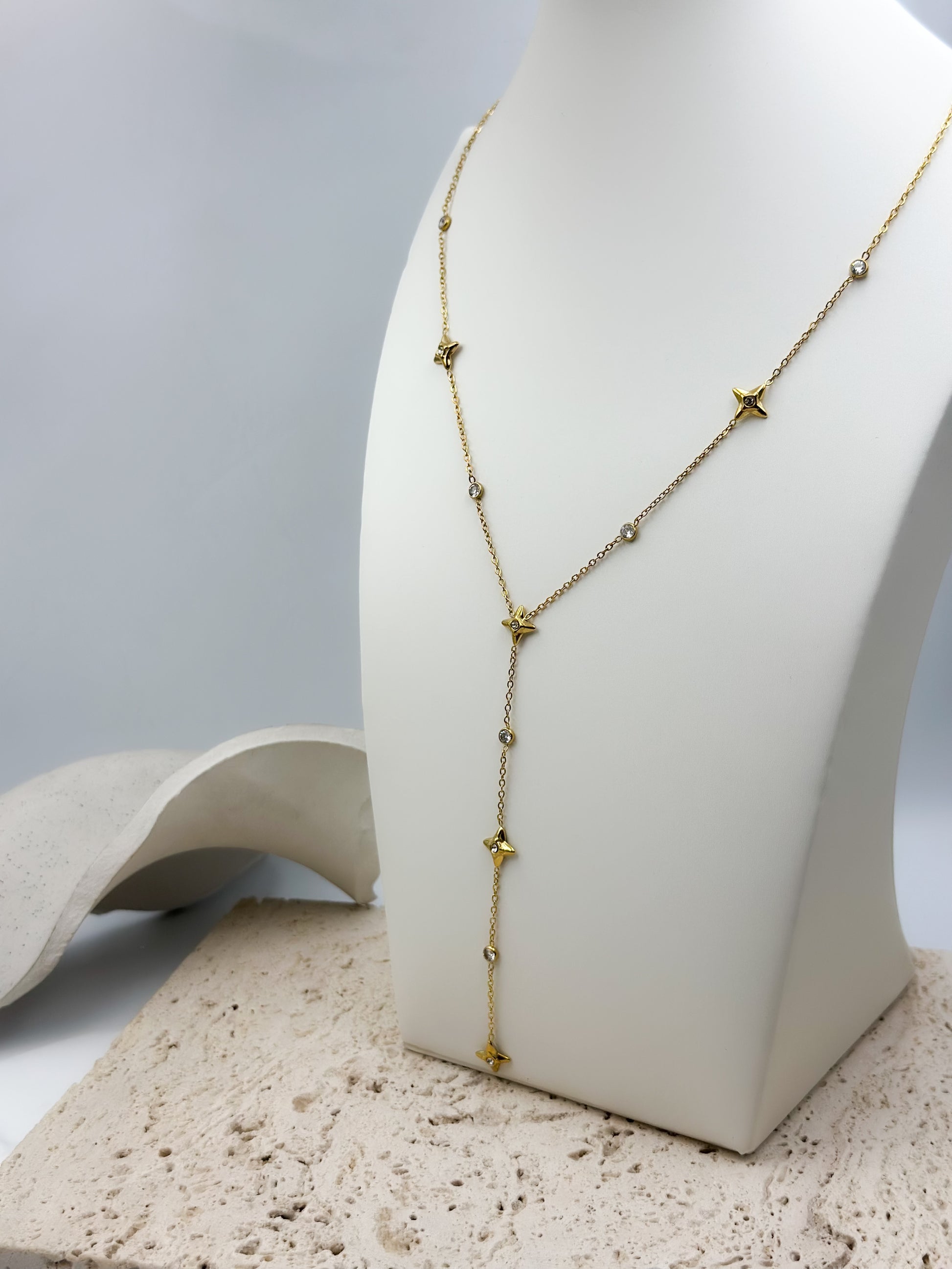 Ένα λεπτεπίλεπτο κολιέ από ανοξείδωτο ατσάλι σε χρυσή απόχρωση, διακοσμημένο με μικρά αστέρια και λαμπερές λεπτομέρειες τύπου ζιργκόν.