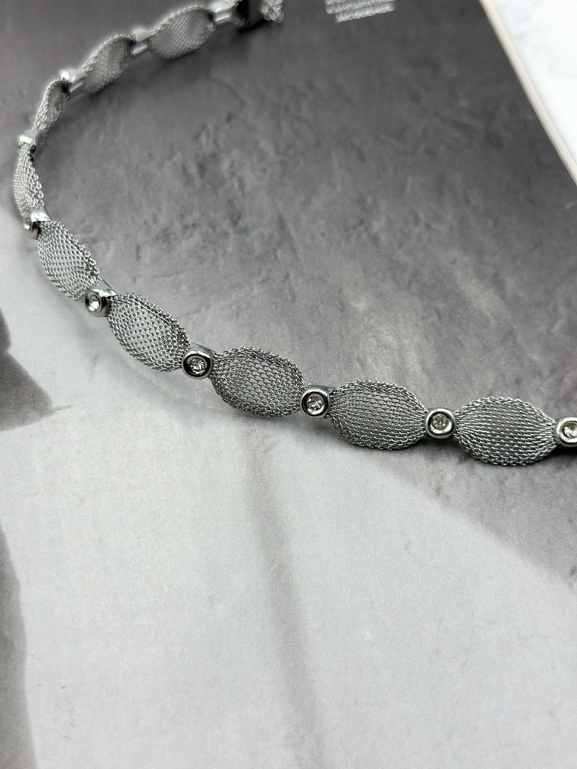 Ατσάλινο κολιέ τζόκερ με εντυπωσιακό πλεκτό σχέδιο και λαμπερές πέτρες ζιργκόν ανάμεσα στους κρίκους.