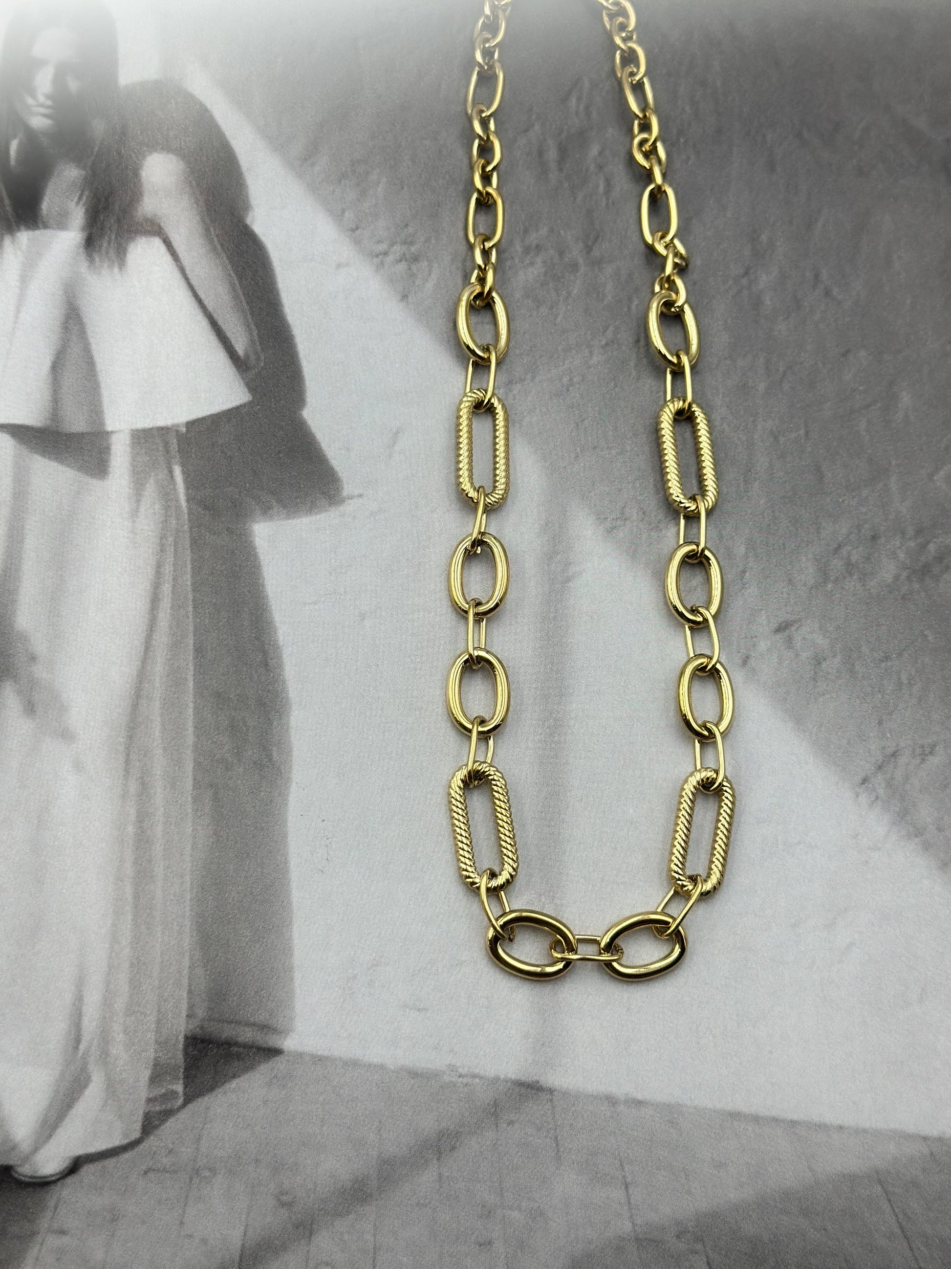 Το “Riviera Gold” είναι ένα elegant ατσάλινο κολιέ με ιδιαίτερους κρίκους σε οβάλ και ορθογώνιο σχήμα, συνδυάζοντας λείες και σχοινένιες υφές για ένα πολυτελές αποτέλεσμα.